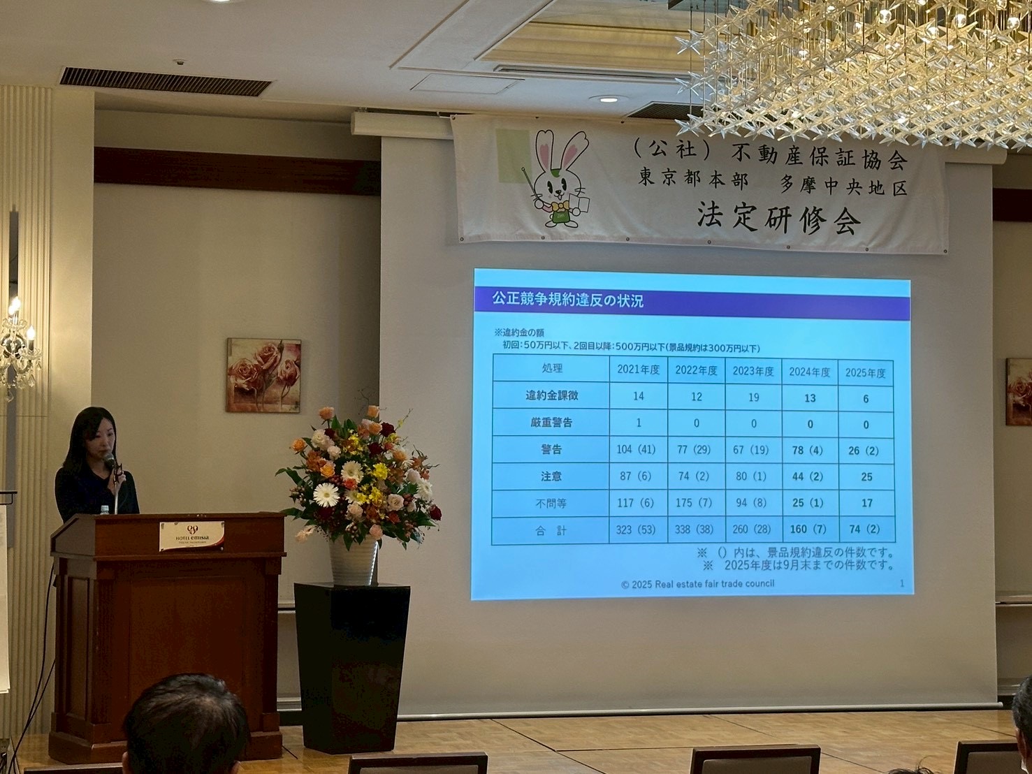 研修会では、「直近の違反事例について」「住宅省エネルギー性能証明書について」、「なぜ空き家が増えてしまうのか?サブリースを用いた空き家等の有効活用について」の3テーマについてご講演を頂きました。昨今の不動産市況に即したテーマという事もあり、実務に即した具体例を上げ盛況の中、閉会する事が出来ました。